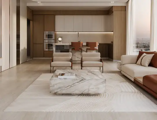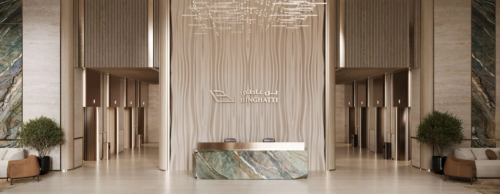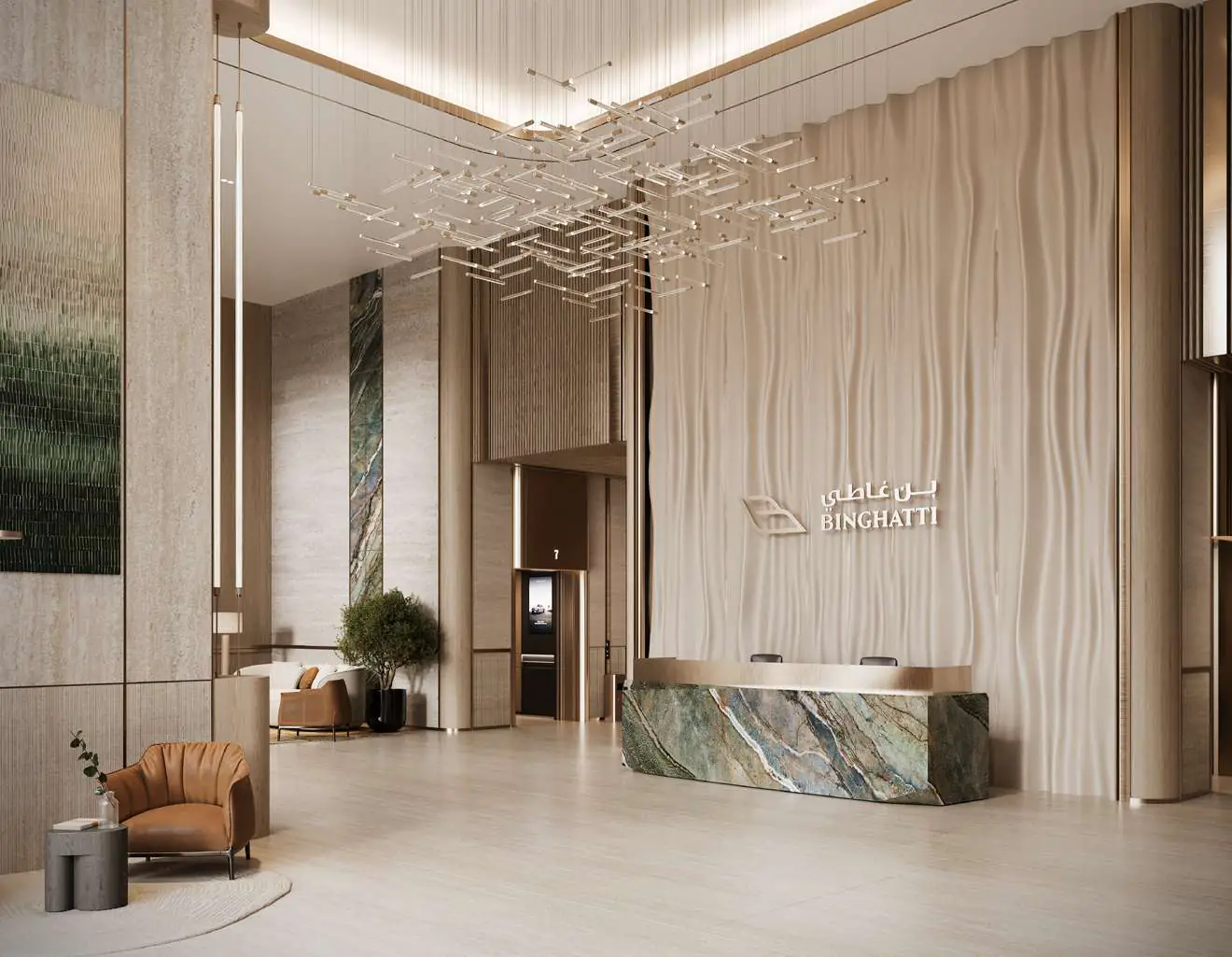 The development’s design reflects Binghatti’s signature illuminated façade, embodying timeless sophistication and modern elegance. Each residence boasts 3.5-metre floor-to-ceiling heights, high-efficiency layouts, and smart home features, with kitchens fully equipped with appliances. Interiors are crafted from a luxurious palette of travertine stone, walnut wood, accent marble, brass, and metallic glass, creating a warm, refined living experience.